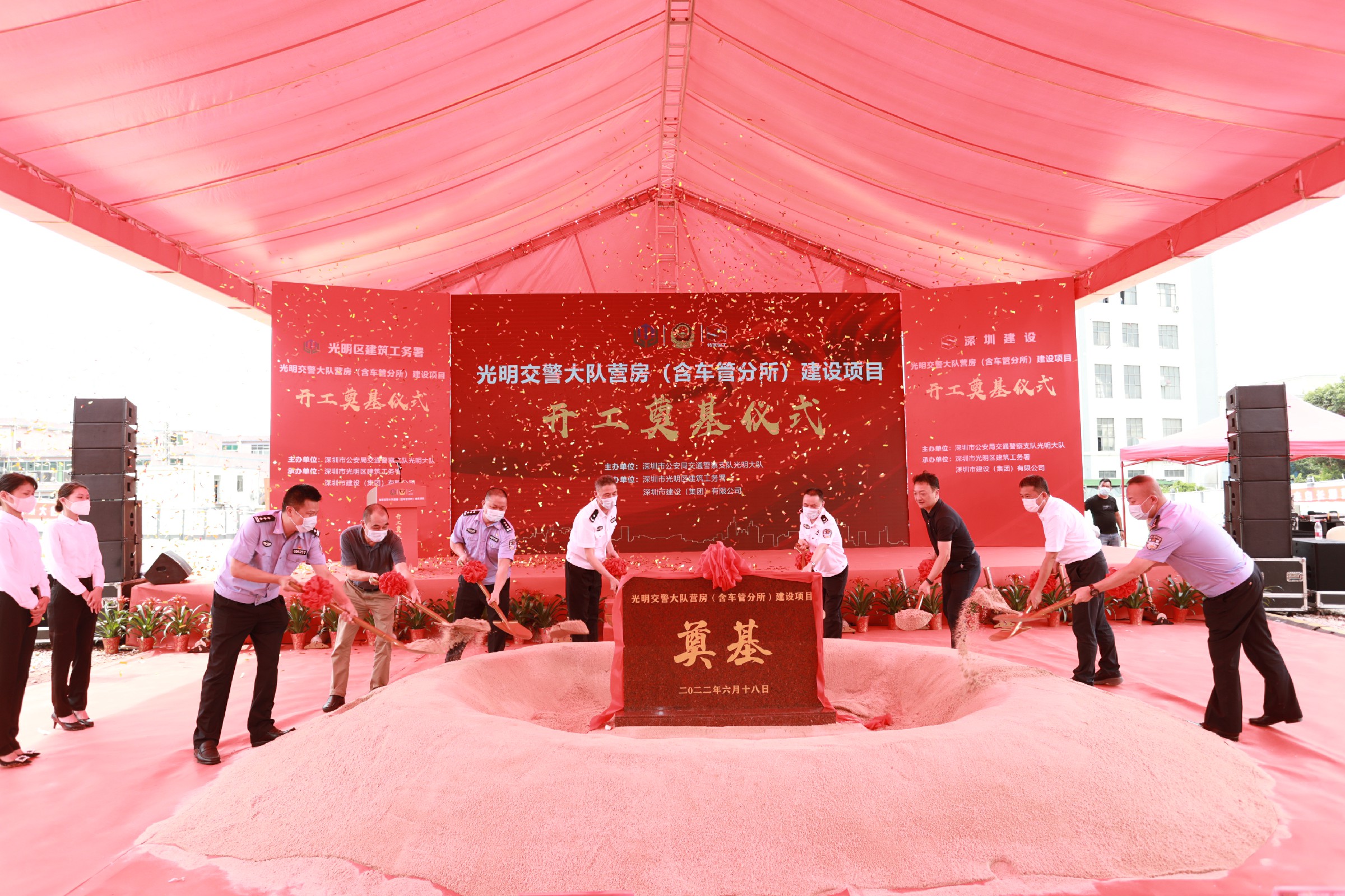 6月18日,由建設(shè)集團(tuán)承建的光明交警大隊營房(含車管分所)建設(shè)項目開工奠基儀式隆重舉行。光明區(qū)副區(qū)長、區(qū)公安分局局長周金堂,市交警局副局長馮道科,光明區(qū)建筑工務(wù)署黨委書記甘鵬、署長黎智、副署長范仕國,羅湖、福田、南山、寶安、龍崗、龍華、鹽田、坪山等各區(qū)交警大隊領(lǐng)導(dǎo),建設(shè)集團(tuán)董事長黃海、黨總支委副書記石宏偉、副總裁李蕃榮、安全總監(jiān)余南華以及項目設(shè)計、勘查、咨詢、監(jiān)理等各參建單位和市交警局相關(guān)單位領(lǐng)導(dǎo)嘉賓出席儀式。